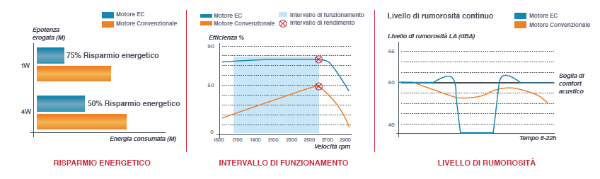 Il consumo energetico si riduce in tutte le velocità di funzionamento fino al 70% rispetto alle unità convenzionali.